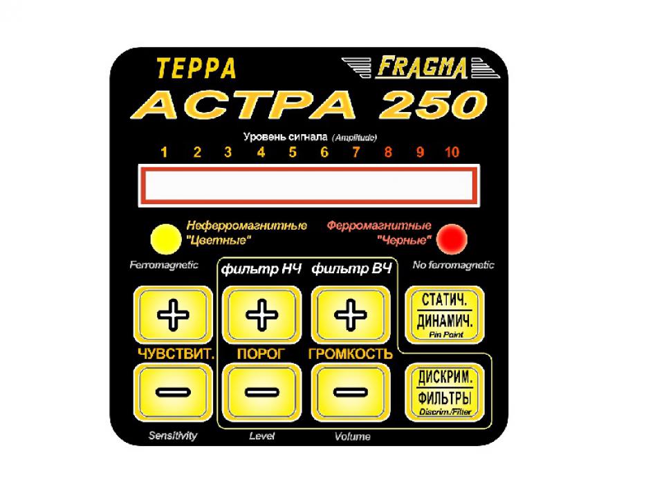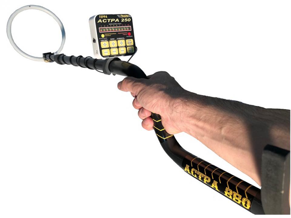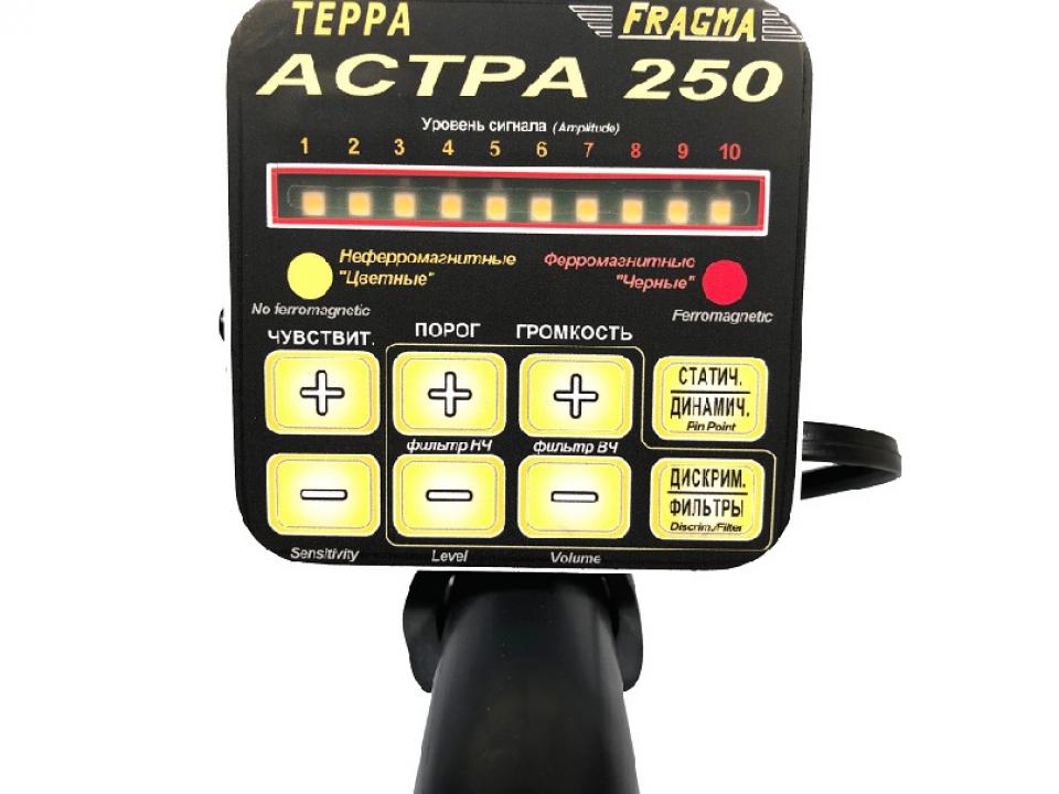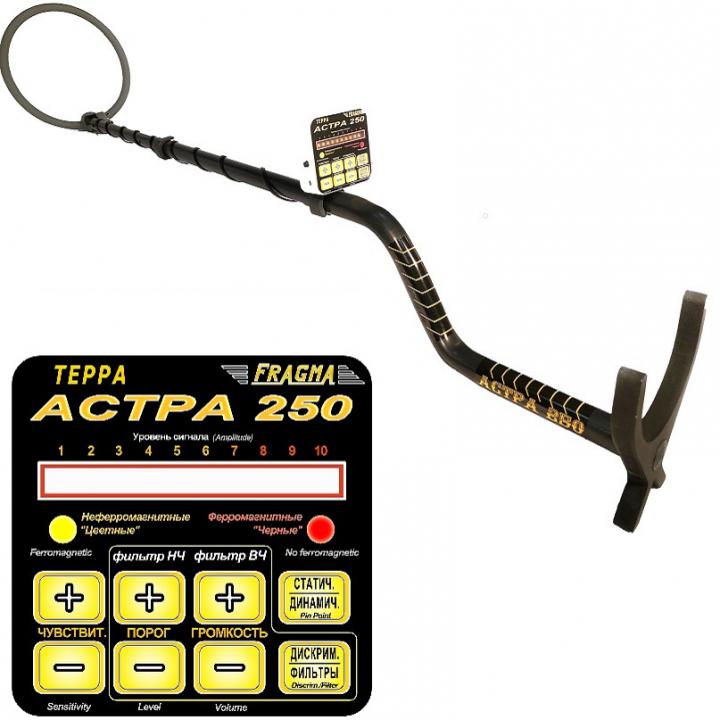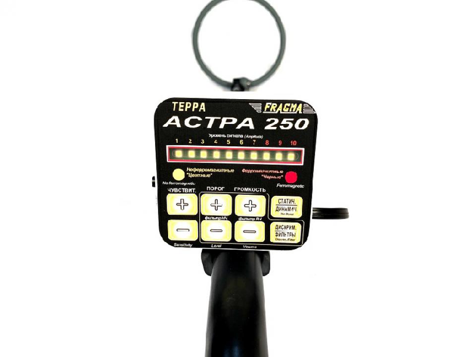 Астра - 250 имеет трехуровневый дискриминатор, и систему дискриминации по размеру объекта. Настройки фильтров позволят пользователю самому выбирать частотную полосу пропускания сигнала (задается нижняя и верхняя частота полосовго фильтра) для динамического режима поиска. Также возможно управление порогом сигнального срабатывания, что дает возможность пользователю добиться рекордных значений чувствительности в грунте и в замусоренной местности. В процессорном блоке встроен динамик звуковой индикации, также прибор имеет выход на наушники. Работа прибора в статическом режиме позволит вам в реальном времени отследить контуры металлического объекта(ов) залегающего под землей, и найти его центр массы. При полностью собранной штанге прибор имеет малые размеры и может применяться для операвтивного досмотра людей и багажа, также стен и ниш. Поисковая катушка прибора (датчик) выполнена в металлопластиковом корпусе, что обеспечивает высокую износостойкость даже при работе по гравию. Как и в других приборах нашего производства датчик полностью водонепроницаемый, т.е. можно осуществлять поиск под водой на глубине до 1 метра не погружая процессорный блок.