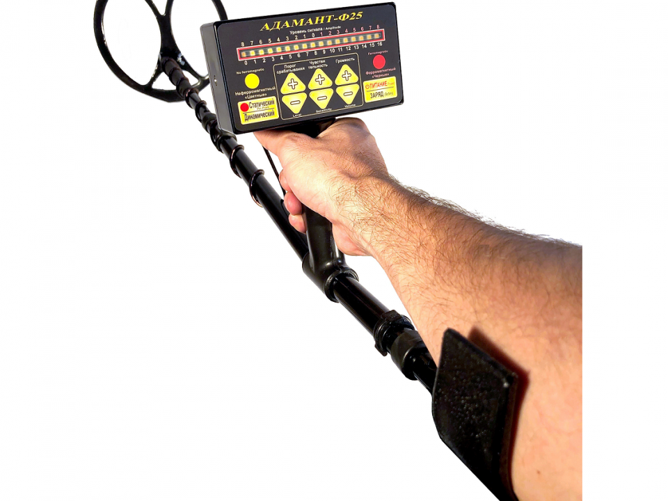 Вашему вниманию представляется профессиональный металлоискатель Адамант Ф25. За несколько лет серийного производства прибор зарекомендовал себя как неприхотливый мощный инструмент на поиске металлических объектов. Притом диапазон задач поиска очень широкий: от небольших реликвий и самородков до рудных месторождений. Как и все металлоискатели фирмы "Фрагма", Адамант Ф25 обладает очень высокой чувствительностью - около 33 сантиметров на монету 5 рублей, предельная - 2 метра. Индикация найденного объекта звуковая политональная, и светодиодная панель позволяет определить тип найденного металла, его приблизительные размеры и глубину до него. В стандартную комплектацию металлоискателя входят: процессорный блок на штанге с телескопическим выдвижным коленом, стандартный водонепроницаемый ударостойкий датчик Д26, подлокотник с мощным аккумулятором, 2 зарядных устройства (от сети 220 Вольт и от прикуривателя автомобиля), наушники и паспорт прибора. Штанга прибора изготовлена из легкого и прочного ПВХ-пластика, длительный поиск не доставляет дискомфорта.